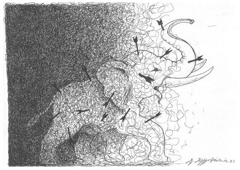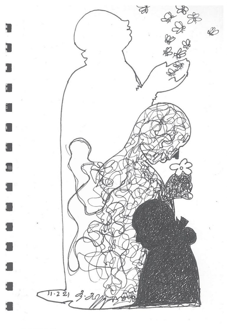 அமிர்தலிங்கம் கோடுகளும் வண்ணங்களும் எளிய மக்களிடையே பயணிக்கிறதைக் காணமுடியும். சில அரூபமான கோடுகள் கூட இந்த மண்ணோடும் மக்களோடும் இணைந்து ரூபங்களாக இணைவதை வெளிப்படையாக உணரலாம். எனக்குத் தெரிந்து பத்துப் பதினைந்து ஆண்டுகளாகத்தான் இந்த மண்ணையும் மக்களையும் குறியீடுகளின் வழி சிலர் வரைவதைப் பார்க்க முடிகிறது. பொதுவாக ஆடு, மாடு, நாய், பூனை, கோழி, புறா எனத் தொடர்ந்து வரையும் ஒருவர் அதிலேயே லயித்து அதனையே தனக்கான அடையாளமாகவும் கொள்ளமுடியும். அதையே அவர்களுக்கான உத்தியாகவும் பயன்படுத்திய நபர்களும் உண்டு. எப்படி இங்கு புத்தர் படத்தை வரைந்தால் நாலு காசு கூடுதலாகப் பார்க்கலாம் என்கிற நினைப்புப் பொதுபுத்தியில் இருக்கிறதோ அப்படித்தான். புத்தருடைய தத்துவத்தைத் தெரியாமல் அல்லது புரியாமல் இருந்தாலும் கூட பரவாயில்லை. அது வரைவதற்கான பொருள் மட்டும்தான் என்பது அவர்களது எண்ணமாகவும் இருக்கலாம். பௌத்த கருத்துகளை உள்வாங்கிய நபர் புத்தரை வரையாமலும் பௌத்தத்தை ஓவியத்தின் வழி கடத்த முடியும். அப்படித்தான், இந்த மக்களை இந்த மண்ணை நேசிக்கக்கூடிய ஒருவரால் வரையவும் எழுதவும் முடியும்.